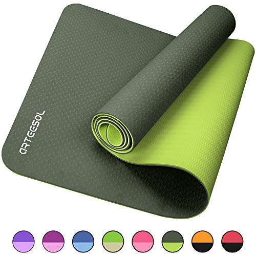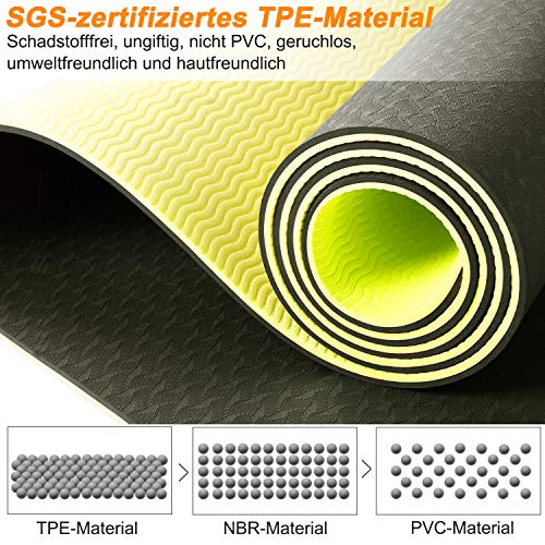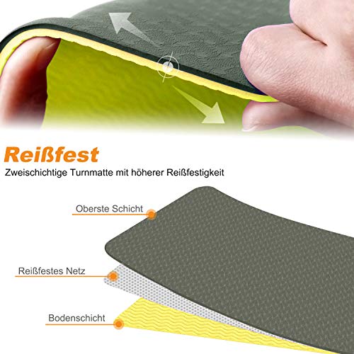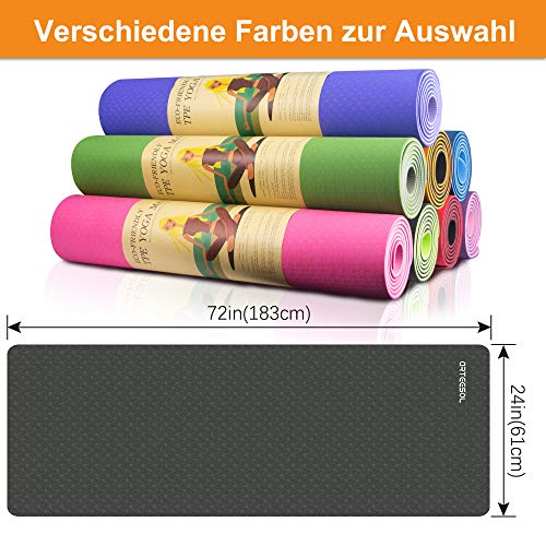 arteesol Gymnastikmatte – Diese Yogamatte ist die perfekte Unterlage für alle Übungen am Boden. Sie ist angenehm weich, rutschfest und sehr robust. Top Qualität Das TPE Material hat eine deutlich höhere Dichte als NBR und PVC. Sie sind nicht zu weich, aber auch nicht zu hart. Ein weiterer Vorteil ist, dass die Matten eine viel längeren Lebensdauer haben. Gute Belastbarkeit Dank der guten Eigenschaften des Materials sind unsere Fitnessmatte gut belastbar, weich und langlebig. Das Material kehrt in seine Ursprungsform nach dem Sport zurück. Rutschfeste Oberfläche Durch das Profil auf den beiden Seiten sind unsere Gymnastikmatte besonders rutschfest. Auf der Rückseite haben die Matten ein Wellenmuster, somit rutschen die Matten auf dem Boden nicht. Einfach zu reinigen Unsere Yogamatten lassen sich mit einer weichen Bürste (oder mit einem Tuch) und Seifenwasser problemlos abwaschen und mit einem Handtuch trocknen. Einfach zu tragen Ein Trageband und eine Tragetasche sind zusammen mit der Matte im Lieferumfang enthalten. Damit kann die Matte leicht verpackt und transportiert werden. Spezifikation: Größe: 183x 61 cm Farbe: Violett, Dunkelblau, Lila, Dunkelgrün-Schwarz, Rose Rot, Orange-Schwarz, Grasgrün, Rot-Schwarz (Bitte auswählen) Lieferumfang: 1 x Yogamatte