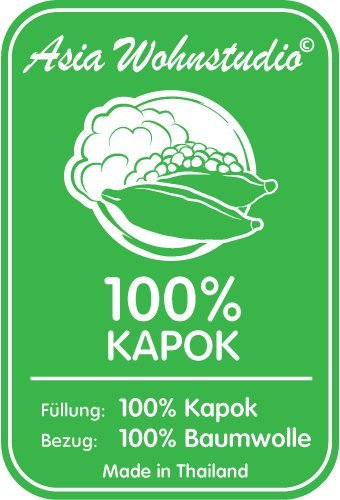 100 % Kapok Nackenkissen der Marke Asia Wohnstudio Klicken Sie bitte auf den Verkäufernamen *Asia Wohnstudio* um zu weiteren tollen Kapokprodukten zu gelangen! Bunte Nackenkissen sind in Thailand seit Jahrhunderten ein fester Bestandteil der Entspannungskultur. Durch ihre besondere Form helfen Sie schnell gegen Verspannungen und verbreiten ein Gefühl der Entspannung. Einzigartige Kapokfüllung: Die Pflanzendaune des Kapokbaumes Unsere Nackenkissen sind auch für den Außenbereich geeignet, da wir die Thaikissen fest mit Kapok füllen lassen. Durch diese besondere Pflanzenfaser kommt keine Bodenkälte hindurch. Kapok ist ein rein pflanzliches Produkt, welches wir unbehandelt und naturbelassen für die Füllung benutzen. Unsere Thai Kissen sind mit 100% Kapok gefüllt und haben einen strapazierfähigen Baumwollbezug aus reiner Baumwolle. Produktinformationen Größe Nackenkissen: 58 cm (Länge) x 17cm (Durchmesser) Gewicht Thaikissen: 450 Gramm Füllung: 100% natürliches Kapok des Kapokbaumes Bezug: 100% Baumwolle. Wir verwenden ausschließlich reine und sehr strapazierfähige Baumwolle Unsere Thaikissen werden in auserlesenen Familienbetrieben handgefertigt und ohne Zwischenhändler von uns direkt importiert! Weitere tolle Kapok Thaikissen erhalten Sie in unserem Amazon Händlershop vom Asia Wohnstudio Asia Wohnstudio Kissen – Ein nachhaltiges Qualitätsprodukt. Geprüfte Qualität mit original Label