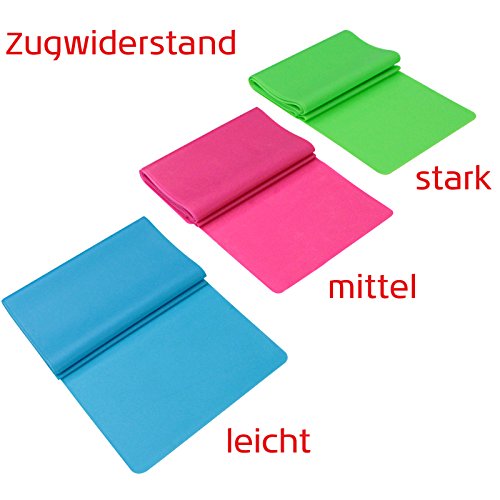 Fitnessband Gymnastikband SANI in 3 verschiedenen Stärken von BB Sport Das kleine handliche Fitnessstudio im Taschenformat – trainieren, egal wo Sie möchten – immer einsetzbar! Ein bedeutendes Plus im Fitnesstraining und in der Therapie. Das hochwertige Fitnessband ist hervorragend für sanfte und gelenkschonende Übungen nach Verletzungen geeignet. Es trainiert mit vielseitigen Anwendungsmöglichkeiten Ihre Körpermuskulatur und ist nahezu für alle Muskelgruppen wie z.B. Hüfte, Bauch, Brust, Schulter, Rücken, Trizeps, Bizeps und Oberschenkel einsetzbar. Ein effektives Training von täglich 10 Minuten ist bereits ausreichend. Das Fitnessband bietet nahezu unbegrenzte Einsatzmöglichkeiten im Kraft-, Ausgleichs- und Koordinationstraining. Das Band eignet sich auch hervorragend für Trainingseinheiten zur Straffung der Bereiche Arme, Bauch, Beine und Po. Set bestehend aus: Fitnessband blau – leichter Widerstand – (Zugkraft entspricht 10 – 12 lb d. h. in etwa 4,54 bis 5,44 kg) – 15 cm x 0,35 x 2,5 mFitnessband rot – mittlerer Widerstand – (Zugkraft entspricht 20 lb d. h. in etwa 9,07 kg) – 15 cm x 0,5 x 2,5 mFitnessband grün – starker Widerstand – (Zugkraft entspricht 30 lb d. h. in etwa 13,61 kg) – 15 cm x 0,6 x 2,5 mHochwertige ProfiqualitätZunehmender ZugwiderstandMaterial: TPE