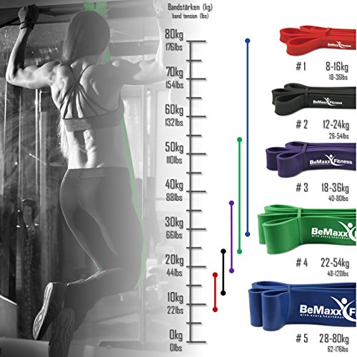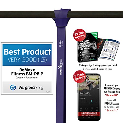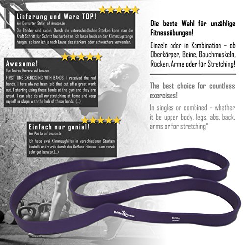 Sie suchen nach einem effektiven Ganzkörper-Trainingsgerät, das extrem vielseitig und kostengünstig ist und sich ganz individuell an Ihre Bedürfnisse anpassen lässt? Sie wollen bei Ihrem Fitnessprogramm ortsunabhängig sein sodass Sie jederzeit und wo Sie gerade wollen trainieren können und nicht auf teure Fitnessstudios angewiesen sind? Dann sind Sie bei uns von BeMaxx Fitness und dem TESTSIEGER mit SEHR GUT in der Kategorie „Power Bänder“ von Vergleich.org genau richtig! Denn wir wissen aus langjähriger Erfahrung und intensiver Kommunikation mit unseren Kunden und erfolgreichen Fitnesstrainern genau, welche Voraussetzungen Pull-Up Power Bands erfüllen müssen, damit Sie die größtmögliche Freude am Training haben. Hier alle Vorteile auf einen Blick: – Vielseitiges, ortsunabhängiges Ganzkörpertraining ganz nach Ihren individuellen Bedürfnissen – 5 verschiedene Power Bands mit unterschiedlichen Widerstandslevels aus denen Sie die ideale Kombination für Ihr Training auswählen können – Jedes Band bietet unendlich viele Trainingsmöglichkeiten, so individuell wie Ihre Trainingsbedürfnisse – Je nach Einsatzgebiet, Kraft und Ausdauer beliebig erweiterbar und kombinierbar – Hochwertig, langlebig, sicher – Kompakt und dank geringer Größe und Gewicht der ideale Reisebegleiter – PLUS: Der ultimative Workout-Guide GRATIS Fehlen nur noch ein eiserner Wille und ein wenig Motivation zum Training – die müssen Sie natürlich schon noch selbst aufbringen 😉 Entdecken Sie diese vielseitigen Fitnessbänder einzeln oder in Kombination für sich und kommen Sie in den Genuss des BeMaxx QUALITÄTSSIEGELS: Holen Sie sich Ihre BeMaxx Fitness Power Bands noch heute völlig ohne Risiko mit unserer 100% GELD-ZURÜCK-GARANTIE.