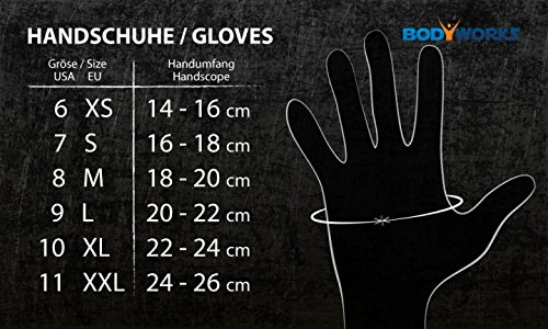 BIG-Power Handschuhe von Bodyworks Wichtig!!! Wir empfehlen, die Handschuhe etwas größer zu bestellen, da bei der Belastung durch das Training der Umfang der Hand zunimmt. Dies kann bei zu kleinen Handschuhen dazu führen, dass die Nähte aufreißen. Die angegebenen Größen und Maße entsprechen dem Umfang des Handtellers. Ein komfortabler Allround-Handschuh für Männer und Frauen in einer super Qualität und einer klasse Passform. Auch gut geeignet für Kursübungen! Der Handrücken ist aus Spandex und die Handschuhe sind Waschbar! – schwarz mit Schwarz/Weiß – Handinnenflächen mit strapazierfähigem Amara und Spezialgriffnoppen für Superhalt – Handrücken Nylon für perfekten Tragekomfort – enorm widerstandsfähiges Material Erhältlich in den Größen: – S = 16 – 18 cm – M = 18 – 20 cm – L = 20 – 22 cm – XL = 22 – 24 cm – XXL = 24 – 26 cm Die Angaben in cm entsprechen dem Umfang des Handtellers. Material: 50% Polyurethan, 45% Nylon, 5% Velcro