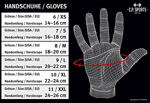 Der C.P. Sports Iron-Handschuh Komfort ist ein qualitativ hochwertiger Trainingshandschuh. Er besteht aus bequemem Elastan am Handrücken und einem robusten, aber sehr geschmeidigen Obermaterial und gewährleistet einen hervorragenden Tragekomfort. Innenhand weiches, gepolstertes Waschleder, doppelt genäht für Langlebigkeit und Superhygiene. Flexibler Klettverschluss am Handgelenk. Hinweis: Bitte beachten Sie, dass durch die Belastung während des Trainings der Handumfang zunehmen kann. Dies sollte bei der Wahl der Größe berücksichtigt werden! Besondere Merkmale: · flexibler Klettverschluss · hervorragender Tragekomfort · gepolstert und doppelt genäht · waschbar Material: 65% Polyurethan, 25% Nylon, 7% Baumwolle, 3% Schaumstoff Erhältlich in den Größen: XS – S – M – L – XL Farbe: neongelb, neonorange, royalblau, pink, rot, schwarz Lieferumfang: 1 Paar C.P. Sports Iron-Handschuh Komfort