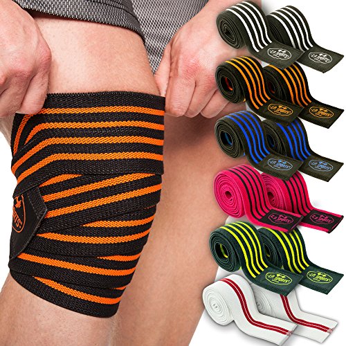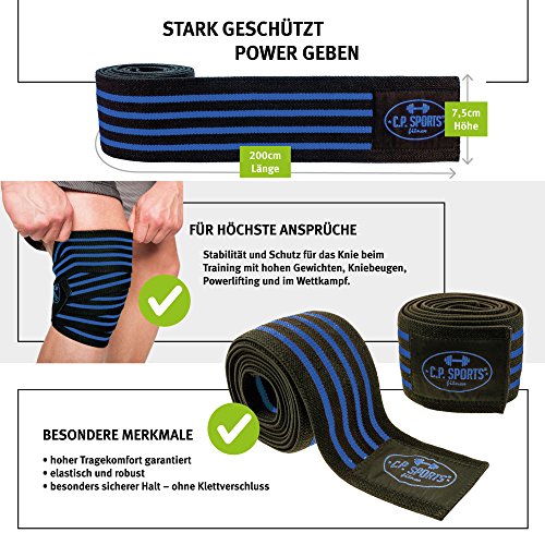 Diese sehr starken und elastischen C.P. Sports Profi-Kniebandagen stabilisieren und stützen das Knie beim Training mit hohen Gewichten, Kniebeugen, Powerlifting und im Wettkampf. Durch die Länge von 200 cm und die Breite von 7,5 cm ist ein hoher Tragekomfort garantiert. Diese Kniebandagen haben extra keine Klettverschlüsse – die Enden werden unter die einggewickelte Bandage gesteckt und bieten somit besonders sicheren Halt, der mit Klettverschlüssen nicht gegeben ist! Kniebandagen sind für Bodybuilder als Schutz der Gelenke unentbehrlich, da sie das Knie entlasten, Stabilität und festen Halt geben. Denn ohne Kniebandagen ist das Risiko für Verletzungen wie z.B. Verrenkungen, Bänderrisse, Sehnenanrisse oder auch Verstauchungen, hoch. Hinweis: Diese Kniebandage muss vom Trainer von der Wade in Richtung Oberschenkel gewickelt werden! Bei besonders hohen Gewichtsbelastungen ist von einer Bandage mit Klettverschluss abzuraten, da sich dieser lösen könnte und somit die Stabilität ruckartig nachlassen würde!! Besondere Merkmale: · 7,5 cm breit und 200 m lang · für höchste Ansprüche im Wettkampf und Training · stabilisieren und schützen das Kniegelenk · elastisch und robust · Handwäsche bei 30 Grad · extra ohne Klettverschluss für perfekten Halt! Material: 80% Polyester, 20% Gummi Einheitsgröße Farbe: weiß/rot Lieferumfang: 1 Paar C.P. Sports Profi-Kniebandagen 200 cm