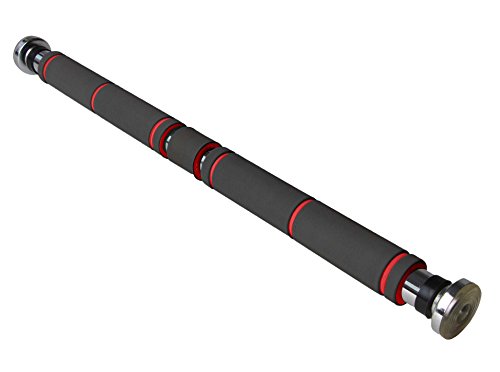 Hochwertige Edelstahl Klimmzugstange mit extra breiten Handpolster! Perfekt für jedes Oberkörpertraining: Intensiveres Training durch Höhenverstellbarkeit bewirkt, dass jede Übung individuell angepasst und gesteigert werden kann. Klimmzüge / Pull-Ups / Chin-Ups: Befestigung oben im Türrahmen. Effektivstes Training für die Rückenmuskulatur, Bizeps und Trizeps. Da die Softrgrip Handpolster über die gesamte Breite der Stange gehen, kann der Griff beliebig variiert werden, für Klimmzüge mit breitem und schmalem Griff, um alle Muskelpartien optimal zu trainieren und beste Ergebnisse erzielen zu können. Dips / Arnold-Dips: Befestigung in der mitte des Türrahmens. Zielmuskeln: Trizeps, großer Brustmuskel und Vorderer Teil des Deltamuskels. Die nach Arnold Schwarzenegger benannten Arnold-Dips sind eine Übung für den Trizeps und die Brust. Beansprucht werden bei dieser Übung vor allem der untere Teil des großen Brustmuskels, der vordere Teil der Schulter sowie der Trizeps Befestige die Stange etwa einen halben Meter über dem Boden. Mit fast durchgestreckten Armen hebst du dein Gesäß ab und bewegst es nach vorne vor den Rand des Polsters. Dein Oberkörper ist aufrecht, dein unterer Rücken ist gerade und deine Bauchmuskeln sind angespannt. Liegestützen – Sit-ups: Befestigung der Stange knapp über dem Boden. Zielmuskel: Brustmuskel, Trizeps und Vorderer Teil des Deltamuskels. Die zwei populärsten Fitnessübungen sind Sit-Ups und Liegestütze und können durch verstellen der höhe der Stange im schwierigkeits Level verändert und angepasst werden. Außer dem klassischen Liegestütz kann man vor allem auch super den negativ – Liegestütz anwenden um die Übung noch intensiverer zu gestalten.