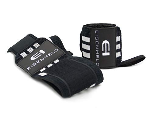 Die EISENHELD Handgelenkbandagen umschließen deine Handgelenke fest und unterstützen dich während harter Trainingseinheiten beim Krafttraining, Powerlifting oder CrossFit. Durch die Bandagen wird die Stabilität der Handgelenke deutlich gesteigert, wodurch ein Abknicken bei der Ausführung der Übung vermieden wird und höhere Gewichte bewältigt werden können. Das Verletzungsrisiko bei Übungen mit hohen Gewichten wird minimiert. Die Materialzusammensetzung der EISENHELD Handgelenkbandagen (70% Polyester und 30% Baumwolle) gewährleistet eine optimale Elastizität was zu einem angenehmen Tragekomfort während der Benutzung sowie einer langen Lebensdauer beiträgt. Die Bandagen haben eine Einheitsgröße von 45,00 cm x 7,50 cm und werden in einer wiederverwendbaren und stabilen Zip-Verpackung geliefert. Ein Produkt besteht aus einem Paar (zwei) Handgelenkbandagen.