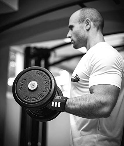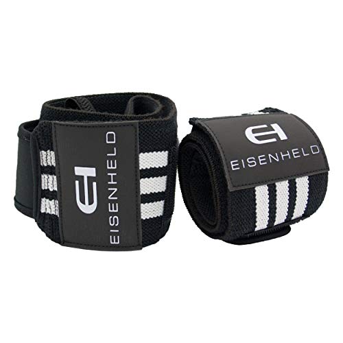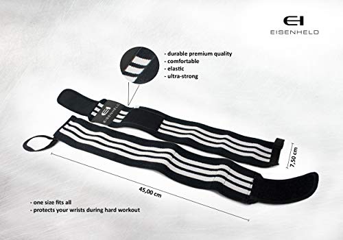 Die EISENHELD Handgelenkbandagen umschließen deine Handgelenke fest und unterstützen dich während harter Trainingseinheiten beim Krafttraining, Powerlifting oder CrossFit. Durch die Bandagen wird die Stabilität der Handgelenke deutlich gesteigert, wodurch ein Abknicken bei der Ausführung der Übung vermieden wird und höhere Gewichte bewältigt werden können. Das Verletzungsrisiko bei Übungen mit hohen Gewichten wird minimiert. Die Materialzusammensetzung der EISENHELD Handgelenkbandagen (70% Polyester und 30% Baumwolle) gewährleistet eine optimale Elastizität was zu einem angenehmen Tragekomfort während der Benutzung sowie einer langen Lebensdauer beiträgt. Die Bandagen haben eine Einheitsgröße von 45,00 cm x 7,50 cm und werden in einer wiederverwendbaren und stabilen Zip-Verpackung geliefert. Ein Produkt besteht aus einem Paar (zwei) Handgelenkbandagen.