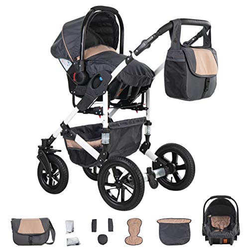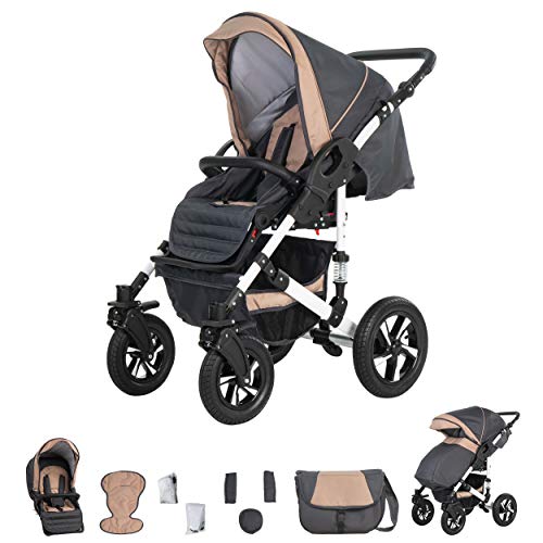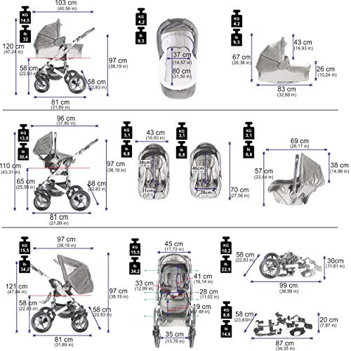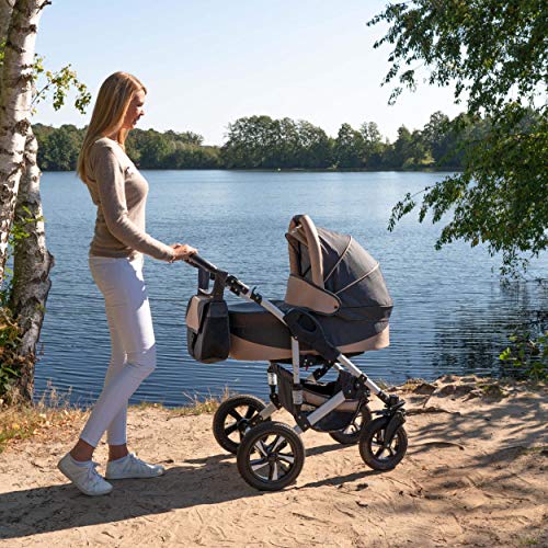 Unser FRIEDRICH HUGO HAMBURG 3 in 1 Kinderwagenset besteht aus: Babywanne, Sportwagen,Autositz Gestell & Zubehör. Die Aufsätze können individuell in beide Richtungen (also in UND gegen die Fahrtrichtung) auf das Gestell gesetzt werden. Die Schwenkräder sorgen für eine besonders gute Manövrierfähigkeit in der Stadt. Die Stoßdämpfer und die Härteverstellung im hinteren Bereich machen den HAMBURG auch und besonders geeignet für Ausflüge auf unwegsamen Böden, im Gelände und sogar auf Splitt!Details KinderwagenaufsatzIn Fahr- & gegen Fahrtrichtung montierbar verstellbare und abnehmbare SonnenhaubeKomfortpolsterung des Innenraums aus kuschelweicher Baumwolleergonomischer, in die Sonnenhaube integrierter TragegriffFußabdeckung inklusiveDetails Autositz ECE R 44 / 04 (Prüfsiegel)zugelassen für den Straßenverkehr nach § 21 der StVOInkl. Fußabdeckung & verstellbarer Sonnenhaubegepolsterter 3-Punkt-Sicherheitsgurt; 2-fach in der Höhe verstellbarstufenlose Einstellung des Gurtumfangs möglichBezug handwaschbar, da komplett abnehmbarDetails BuggyIn Fahr- und gegen Fahrtrichtung montierbarverstellbare Sonnenhaube mit verschließbarem AußenfachMehrstufig verstellbare RückenlehneSchlafposition möglichverstellbare Fußablage mit SchutzbezugGepolsterter 5-Punkt SicherheitsgurtAbnehmbarer Sicherheitsbügel (Rausfallschutz) Details Gestelläußerst stabiles Gestell aus einer Aluminium/Stahl-LegierungKomfort-Fahrwerk mit regelbarer FederungVorderräder: ca. 24 cm und um 360 Grad schwenkbar; inklusive Feststellfunktion Hinterräder: ca. 30 cmLeichtgängige Sicherheitsbremsebesonders angenehmer Soft-Touch-Schiebegriff; mehrfach höhenverstellbar (s.Oben)geräumiger und abnehmbarer Einkaufskorb unter den Aufsätzen AllgemeinesTextilmaterialien sind speziell für Kinderwagen entwickelt worden