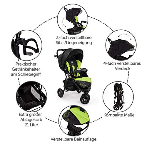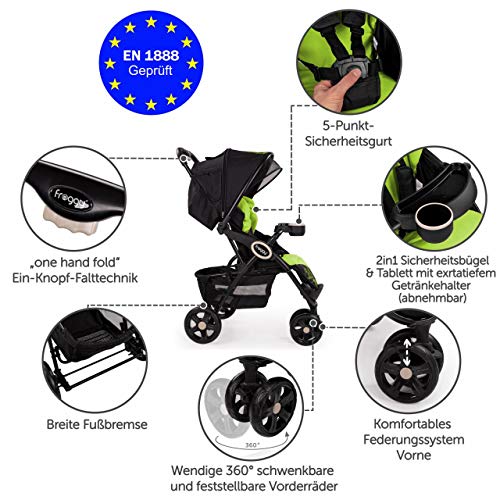 Kinderbuggy DINGO ist ein wahrer Allrounder unter den Kinderwägen. DINGO wurde speziell für die täglichen Anforderungen des Alltags konzipiert, denn er überzeugt nicht nur durch sein schlichtes Design, sondern ist dabei auch sehr wendig und in wenigen Sekunden zusammengeklappt.- Geeignet für Kinder im Alter zwischen 6 – 36 Monaten und einem Körpergewicht von max. 15 kg- Ein-Knopf-Falttechnik für einfaches Auseinander- und Zusammenklappen mit automatischer Verriegelung- Praktischer Getränkehalter am Sicherheitsbügel- Zusätzlicher großzügiger Unterkorb als weitere Ablagefläche (max. Zuladung 3 kg)- Abnehmbares Sonnenverdeck mit Klimafunktion, Fenster und Rückentasche- Gepolsterter 5-Punkt Sicherheitsgurt- ?One-Touch? Doppel-Hinterradbremse- Die erschütterungsgedämpften Vorderräder sind frei schwenk- sowie bei Bedarf feststellbarProduktdetails- Abmessungen:- Aufgeklappt (L x B x H): ca. 73 x 53 x 99 cm- Klappmaß (L x B x H): ca. 91 x 53 x 40 cm- Ø Hinterreifen: ca. 8 Zoll- Ø Vorderreifen: ca. 7 Zoll- Gewicht: 9,4 kgTextile Rohstoff-zusammensetzung- 100% PolyesterLieferumfang- 1 x Kinderwagen DINGO- 1 x Bedienungsanleitung (DE, E)- Der Autositz ist NICHT im Lieferumfang enthalten!