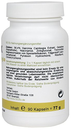 Mit EXVital GC Ex erhalten sie 1500 mg Garcinia Gambogia Extrakt (je Tagesdosis) -ein hochdosiertes Produkt in deutscher Spitzenqualität. Hauptbestandteil von GC Ex ist die bekannte Frucht aus Südostasien Garcinia Cambogia. Bekannt aus den USA erringt Garcinia Cambogia bei uns auch immer mehr Bekanntheitsgrad. EXVital GC Ex ist zusätzlich angereichert mit Vitamin B2, Vitamin B6, Zink und Chrom. Diese versorgen Sie mit wichtigen Vitaminen und Mineralstoffen:Riboflavin (Vitamin B2) trägt zu einem normalen Energiestoffwechsel bei. Vitamin B6 trägt zur Verringerung von Müdigkeit und Ermüdung bei . Zink trägt zu einem normalen Kohlenhydrat-Stoffwechsel bei. Chrom trägt zur Aufrechterhaltung eines normalen Blutzuckerspiegels bei.GC Ex ist ein Kombi-Produkt bestehend aus Garcinia Cambogia Extrakt und Vitamin B2 B6, Zink und Chrom.Bestellen Sie sich jetzt die Monatspackung GC Ex und probieren Sie es aus!