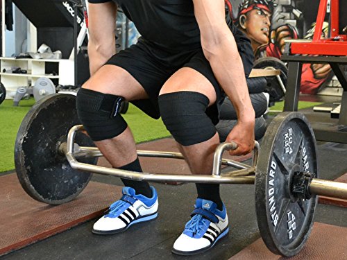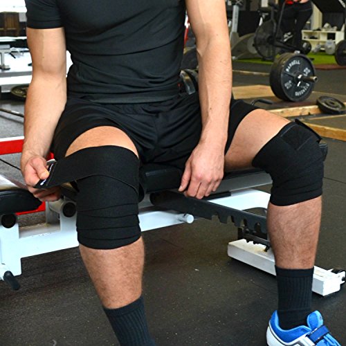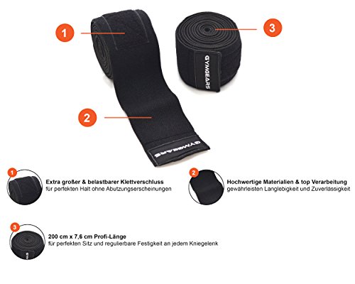 GYMGEARS Kniebandage für Kraftsport. Größe: 200 cm x 7,6 cm (78 inches x 3 inches) mit extra großem Klettverschluss für besseren Halt bei Übungen mit schwerem Gewicht. MAXIMALE STABILITÄT – Optimale Stabilisation der Kniegelenke beim Krafttraining! Die Kombination aus spezieller Materialmixtur und Doppelnaht-Technologie führt zu mehr Sicherheit bei Kniebeugen, Beinpresse, Kreuzheben und Co. FLEXIBILITÄT & HALT – Sparen Sie durch unkompliziertes Anlegen wertvolle Zeit und holen Sie das Maximale aus Ihrer Trainingszeit! Für Lauftraining nicht geeignet. PREMIUM QUALITÄT – Hochwertige Materialien und top Verarbeitung gewährleisten Langlebigkeit und Zuverlässigkeit beim Krafttraining! Atmungsaktiv und angenehm auf der Haut. ZUFRIEDENHEITSGARANTIE – Zufriedene Kunden sind uns wichtig. Kontaktieren Sie uns gerne bei Fragen zu unseren Produkten.