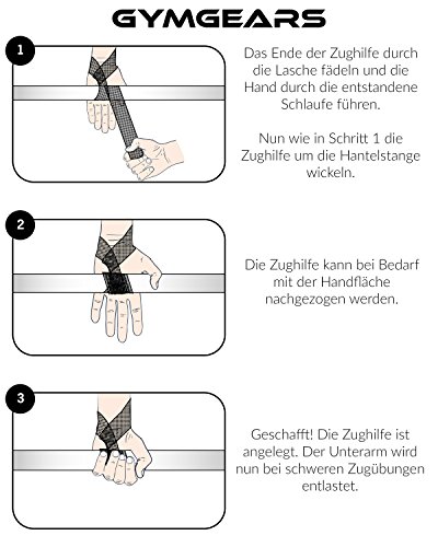 Möchten Sie das maximale aus Ihrem Training herausholen? Mehr Gewicht bewegen, stärker und muskulöser werden?Unterstützen Sie Ihr Training mit den GYMGEARS Lifting Straps für mehr Leistung und Kraft!MarkenqualitätMit den Zughilfen von GYMGEARS erwerben Sie ein hochwertiges Markenprodukt für Ihr Krafttraining. Erstklassige Verarbeitung sowie das äußerst strapazierfähige Material machen unsere Zughilfen zur ersten Wahl.Ihre VorteileUnsere Zughilfen sind extrem stabil und bieten zugleich optimalen Tragekomfort. Die Zughilfen unterstützen Sie während des Trainings oder im Wettkampf bei allen schweren Zugübungen, wie beispielsweise Kreuzheben, Klimmzügen und Langhantelrudern. Dabei können Sie auch in Kombination mit Trainingshandschuhen oder Handgelenkbandagen eingesetzt werden.Das Material ist pflegeleicht, hautfreundlich und frei von Schadstoffen.Perfekt geeignet……für alle gängigen Kraftsportarten wie Bodybuilding, CrossFit, Powerlifting, Olympisches Gewichtheben, Fitness-Training, Calisthenics, Bodyweight-Training, Strongman, Freeletics und vieles mehr.100% Zufriedenheits-GarantieBestellen Sie jetzt komplett sorgenfrei! Wir gewähren Ihnen volle 2 Jahre Garantie – ohne Wenn und Aber!Unser freundlicher 24/7 Kundensupport hilft Ihnen bei Fragen oder Anregungen jederzeit gerne weiter.Lieferumfang:-> 1 Paar (2 Zughilfen) GYMGEARS Lifting Straps in der Farbe Ihrer Wahl-> Praktische Zip-Verpackung für einfachen Transport und optimale Aufbewahrung-> One Size fits all: Einheitsgröße – Für Frauen und Männer geeignet-> Größe: 60 cm x 4 cm-> Material: 90% Baumwolle 5% Nylon 5% Neopren-Polster-> Für Handwäsche geeignet