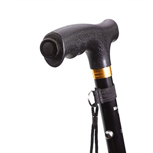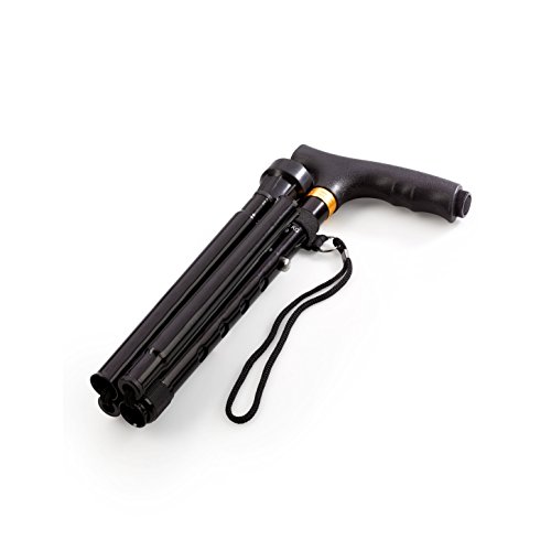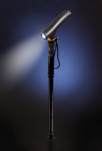 faltbarer Spazierstock mit LED-Licht Faltbarer Gehstock mit Licht Sicherer gehen, mehr sehen, besser gesehen werden Zusammengeklappt misst dieser Gehstock gerade einmal 30 x 14 x 3,5 cm (Gewicht 402 g) und kann so bequem überall hin mitgenommen werden. Die 4 Stocksegmente sind durch 2 starke Gummibänder im Inneren verbunden und schieben sich fast wie von selbst ineinander. Ebenso schnell ist der Stock wieder zusammengeklappt und verstaut. Eine Gehhilfe, die nur zum Vorschein kommt, wenn man sie auch benötigt – beim Spaziergang, auf Reisen, beim Einkaufen, etc. Der Gehstock vermittelt ein beruhigendes Sicherheitsgefühl auf rutschigem Untergrund (Nässe, Glätte, herabgefallene Blätter), denn der breite Gummifuß bietet guten Halt. Der ergonomisch geformte Kunststoffgriff liegt angenehm in der Hand und hinterlässt auch nach längeren Spaziergängen keine Druckstellen. Ein weiterer Clou ist das im Griff integrierte, superhelle aber energiesparende LED-Licht (Ein-/Ausschaltknopf ebenfalls im Griff). Es erhellt nicht nur dunkle Wege und erleichtert das Finden des Schlüssellochs – es sorgt auch für mehr Sicherheit im Verkehr, da man von entgegenkommenden Fahrzeugen besser gesehen wird. Das elegante Design (lackschwarzes Aluminium) und die praktische Handgelenkschlaufe komplettieren diesen durchdachten Gehstock. Der Stock ist 5-fach höhenverstellbar (von ca. 85 – 95 cm). Betrieb durch 2 x AA Batterien (nicht im Lieferumfang enthalten. Für Personen bis ca. 120 kg geeignet. Die Vorteile auf einen Blick:- klein, leicht und handlich- schnell auseinander- bzw. zusammengeklappt- ideal für unterwegs- ergonomisch geformter Griff- rutschsicherer Gummifuß- mit superhellem LED-Licht- besser sehen, besser gesehen werden- für mehr Sicherheit