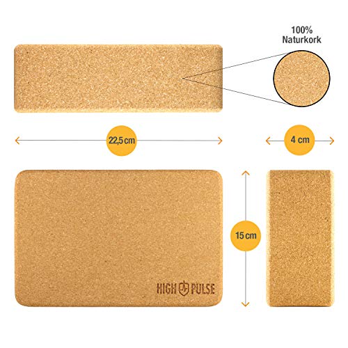 High Pulse Yogaklötze aus Kork (2 Stück) Ein Yoga Brick ist das ideale Accessoire für Ihre Pilates- oder Yogaübungen. Besonders für Einsteiger und Anfänger, die noch nicht so flexibel sind, kann die Zuhilfenahme eines Yoga Blocks sinnvoll sein. Der Yoga Korkblock kann sowohl hochkant als auch flach auf den Boden gelegt werden, sodass Sie sich mit der Hand auf diesem abstützen können, wenn Ihre Beweglichkeit noch nicht ausreicht – etwa, um die Hand neben dem Fuß auf dem Boden abzusetzen, wie es für die korrekte Ausführung des Dreiecks (Trikonasana) erforderlich ist. Zusätzlich können mithilfe des Yogablocks auch Verspannungen und Blockaden gelöst werden. Begeben Sie sich dafür in Rückenlage und platzieren Sie den Block einfach im unteren oder oberen Rückenbereich, je nachdem, ob Sie Probleme im Bereich der Lendenwirbel, Brustwirbel oder Schulterblätter verspüren. Der entsprechende Bereich wird gedehnt, der Druck nimmt ab und Sie fühlen sich wieder entspannt. Material und Beschaffenheit: Der Yogabrick besteht aus Naturkork und überzeugt durch seine Strapazierfähigkeit und Stabilität – gleichzeitig ist er besonders leicht und handlich. Das aus der Rinde der Korkeiche gewonnene Material ist formstabil und rutschfest. Die abgerundeten Ecken und Kanten ermöglichen eine angenehme Handhabung. Maße: ca. 14,5 x 22,5 x 7 cm Gewicht: 0,7 kg