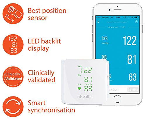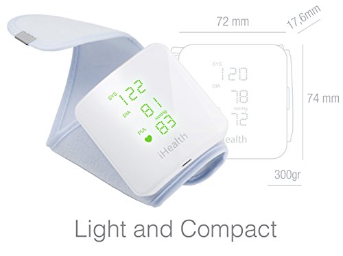 Mit iHealth wird Ihr iPad, iPod Touch oder iPhone zum Blutdruckmessgerät. Übertragung, Verfolgung und Kontrolle des Blutdrucks via Smartphone und Tablet. Highlights: -Vollautomatische Messung des Blutdrucks (systolisch und diastolisch) und der Herzfrequenz (Anzahl der Herzschläge pro Minute) -Automatische Arrhythmie-Erkennung -Universal-Handgelenksmanschette für Handgelenksumfänge 13.5 – 22 cm -Direkte Anzeige der Ergebnisse auf dem Display und sichere Auswertung der Daten mit Hilfe der iHealth MyVitals App -Positionierungsanzeige: Messung nur möglich, wenn sich das Handgelenk in der korrekten Position für die Messung befindet -Klassifizierung der Messergebnisse gemäß WHO (Weltgesundheitsorganisation) -Speicherkapazität für bis zu 120 Messergebnisse -Zertifiziertes Medizinprodukt nach MPG (Medizinproduktegesetz) -Klinisch validiert und von der ESH (Europäische Gesellschaft für Bluthochdruck) zugelassen -Kabellose Synchronisation mit der kostenlosen iHealth MyVitals App via Bluetooth 4.0 -In Verbindung mit der iHealth MyVitals App -Überwachung und Analyse der Ergebnisse, Fortschritte und Trends anhand leicht verständlicher Diagramme und Grafiken -Festlegen von Zielen und Erinnerungen zum Blutdruckmessen -Speicherung der Daten in einer sicheren und zertifizierten Cloud -Austausch der Ergebnisse mit Arzt, Pflegediensten oder Familie -Kompatibel mit Apple Health Grundeigenschaften -Farbe: Weiß -Höhe: 72 mm -Breite: 74 mm -Tiefe: 17,6 mm -Gewicht: 120 g -Produkttyp: Medizinisches Zubehör Akku -Akkutyp: Li-Ion -Kapazität: 400 mAh Technische Beschreibung -Manschettenumfang: 13,5 – 22 cm -Messverfahren: oszillometrisch, mit automatischem Auf- und Abpumpen -Batterie: 5 V bis zu 1 A, 1 x 3.7 V
