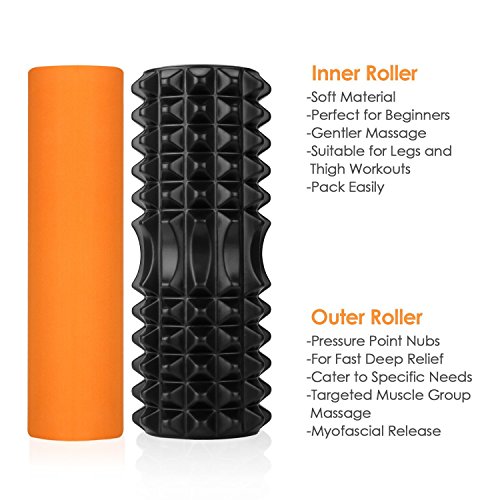INTEY Faszien Rolle Set- Das ideale Trainingsgerät zur Selbstmassage für alle, die Faszien massieren & Verklebungen lösen möchten. INTEY Faszienrolle kommt mit einer großen härteren Blackroll und einer kleineren weicheren Orange Roll. Die Innen Massagerolle aus festem Schaumstoff ist herausnehmbar und ist auch fest mit dem schwarz Foamroller verbunden. Diese Faszien-Massagerolle ist als Trainingsgerät optimal für Rücken- und Rumpfübungen, sowie die Kräftigung der unteren Extremitäten geeignet. Ein umfassendes Training ist somit garantiert! Eigenschaften * Faszinierende Farbkombinationr mit Schwarz und Orange * Stimuliert Ihre Bindegewebe und entspannt Ihre Muskeln * verschiedene Oberflächenmuster für unterschiedliche Druckstärken * Eine gute Ergänzung zu jedem Training, um die Muskulatur locker zu halten * 3 Massagetypen in der Äusseren Rolle für eine vielfältige Myofasziale Entspannung * Ideal zur Triggerpunkt-Massage im oberen und unteren Rückenbereich, Nacken, Unter- und Oberschenkel, Deltamuskulatur und Brust * Steigern Sie Ihre Fitness, indem Sie Balance und Haltung durch Stärkung des Rückens und der Körpermitte trainieren! Hinweis Die beiden Balance Rollen sind geruchsneutral und sondern keinerlei Gerüche ab. Aber Alle eingeschlossenen Verpackungsprodukte werden etwas Geruch erzeugen. Dieser Geruch wird keinen Schaden für den menschlichen Körper produzieren. Wir empfehlen, dass der Foam Roller gesonnt werden, um den Geruch zu beseitigen, bevor Sie die Gymnastikrolle verwenden. Material Triggerpunkt Foamroller: EVA, PVC-Innenrolle Runde Weicher Foamroller: EVA Abmessungen Triggerpunkt Foamroller (740 g): 32.8 x 12.5 cm Runder Weicher Foamroller (95 g): 32.8 x 8 cm Lieferumfang 1x INTEY 2 in 1 Faszienrolle 1x Aufbeahrungstasche 1x Anleitung für den Übungen