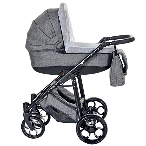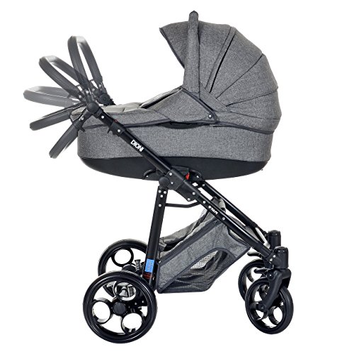 höhenverstellbarer Schiebegriff Großer Einkaufskorb mit Abdeckung Fronträder 360 Grad schwenkbar und mit Federung Babywanne mit von außen verstellbarer Höhe der Kopfstütze Buggy mit Liegeposition durch verstellbare Rückenlehne Schrittgurt an Rausfallbarriere und verstellbare Beinstütze Barriere und Beinstütze anteilig aus Eco Leder mit Folienüberzug als Schutz vor Nässe und Schmutz 5-Punkt-Gurtsystem, und Fuß-Abdeckung Flaschenhalter Autositz Babyschale 0-13 kg Gruppe 0+ ECE R44/04 3-Punkt-Gurt-System Verstellbare Tragegriff Verdeck und Bezüge abnehmbar und leicht zu reinigen Fuß-Abdeckung Moskitonetz Komfort Sitzeinlage DIONI Highlights 100% pannenfreie Bereifung und komfortabel wie Luftreifen Babywanne Faltmechanismus innvovativ und platzsparend Wanne und Buggy mit mehrfacher Positionierung am Sonnenverdeck Buggy mit Liege- bzw. Schlafposition Buggy und Babywanne in Fahrt- und gegen Fahrtrichtung anbringen Regenschutzabdeckung und Moskitonetz Große Wickeltasche mit wasserdichter Wickelmatte Isofix Basisstation für das Auto nachbestellbar technische Angaben aufgebaut (L/B/H) 83x64x114 cm geklappt(L/B/H) 87x64x34 cm Schiebegriff Höhe 74-114 cm Sitzbreite 34 cm Sitztiefe 27 cm Rückenlehne Höhe 53 cm Beinstützenlänge 22 cm Babywanne Innen(L/B/H) 80x37x22 cm Durchmesser Räder 24 cm / 28 cm Gewichtsangaben Gestell + Räder 8 kg Babywanne 6 kg Buggy(Sitz-Einheit) 5 kg Auto-Babyschale 4 kg