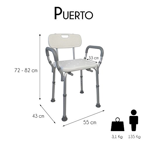 Dieser Stuhl ist aus Aluminium hergestellt und passt sich hervorragend an die Bedürfnisse des Nutzers an. Jedes einzelne Stuhlbein kann individuell auf 5 Stufen eingestellt werden. Die Rücken- als auch die Armlehnen lassen sich mit einem einzigen „Klick“ entfernen. Das Drainage-System im Sitz läßt das Wasser einfach ablaufen und vermeidet dadurch jegliche Wasseransammlung, die zu Instabilität führen könnte . Die Armlehnen sind mit Schaumstoff ausgekleidet und machen den Grip komfortabler. Die Rückenlehne hat einen Griff für den einfachen Transport.Technische Eigenschaften:- Höhe: 72 – 82 cm – Maximale Belastung: 100 kg – Gesamtbreite: 32 cm – Gesamtlänge: 45 cm – Sitzlänge: 32 cm – Sitzhöhe: 44-54 cm – Abstand zwischen den vorderen Beinen: 32 cm – Abstand zwischen den vorderen und den hinteren Beinen: 32 cm – Innerer Abstand zwischen den vorderen Beinen: 21,5 cm – Innerer Abstand zwischen den vorderen und den hinteren Beinen: 21,5 cm – Gewicht: 3,2 kg