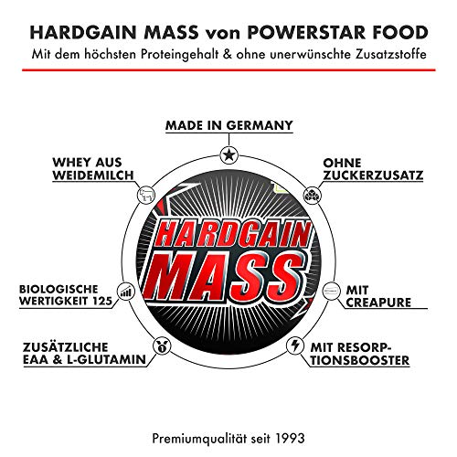 Hochwertiges Protein- und Kohlenhydratpulver zur Zubereitung eines proteinreichen Eiweißdrinks mit Vitaminen; aromatisiertPOWERSTAR FOOD HARDGAIN MASS Für alle HARDGAINER die nur schwer zunehmen und viele Kohlenhydrate essen können, ohne dick zu werden. Genau der richtige Weight Gainer für deinen Stoffwechsel-Typ. Hinweis: Eine ausgewogene und abwechslungsreiche Ernährung, sowie eine gesunde Lebensweise sind von großer Bedeutung. Überschreiten Sie die angegebene tägliche Verzehrsmenge nicht. Zutaten: Kohlenhydratformel 65,8% = Trehalose* und hochmolekulares Kohlenhydrathydrolysat, ProteCore Proteinformel 29,5% = Wheyprotein** und mizellares Kasein** (Kasein, Globuline, Lactoferrin, Alpha-Lactalbumin, Beta-Lactoglobulin) sowie Weizenprotein und Lupinenprotein, Rote Bete Pulver (Geschmacksrichtung Erdbeer), Kakaopulver stark entölt (GR. Schoko und Schoko-Nuss), Magermilchpulver**, Inulin, kaltgepresste teilfermentierte Weizenkeime, L-Valin, L-Leucin, L-Isoleucin, L-Glutamin, L-Arginin, Vitaminmischung (Vitamin pro 100g: siehe Tabelle), Myo-Inositol 0,13%, Spinatextrakt, Aromen, Säuerungsmittel Zitronensäure, Zinksulfat 0,01%, Gewürzextrakt, Lactobacillus acidophilus, Bifidobacterium bifidum, Chrom(III)-chlorid 0,00011%. *: Trehalose ist eine Glucosequelle. **: Ein aus Milch gewonnenes Erzeugnis, das Laktose enthält. Verzehrsempfehlung: 80g in 300ml Milch. An Trainingstagen 1 Drink ca. 2-3 Stunden vor dem Training und 1 Drink schnellstmöglich nach dem Training. An trainingsfreien Tagen 1 Drink morgens zwischen den Mahlzeiten und den 2. vorzugsweise vor dem Schlafengehen. Lagerung: Beutel immer verschlossen, kühl, trocken und außerhalb der Reichweite von Kindern aufbewahren.