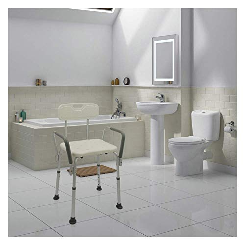 Duschstuhl oder Badewanne. aus hochwertigem Aluminium und grobem Kunststoff. Ideal für ältere Menschen. Großeltern oder Menschen mit eingeschränkter Mobilität. Idealer Stuhl. der in einer Dusche oder Badewanne installiert werden kann und bequem unter der Dusche sitzt. Großer rechteckiger und ergonomischer Sitz für mehr Komfort. Sicherheit und Stabilität. Es hat rutschfeste Armlehnen. Spezifikationen Duschstuhlhöhenverstellbar. mit rutschfesten Armlehnen. Aluminiumstruktur von 1.25 mm Dicke. Boden und Rücken aus PE-Kunststoff (Polyethylen). rauh. rutschfest. Grundgröße: 44 x 45 cm. Einstellbare Höhe in 6 Positionen. Maximale Höhe der Rückenlehne von 72 bis 85 cm. Rohrförmige Aluminiumstruktur von verschiedenen Abschnitten: 28.6 mm. 25.4 mm und 22.2 mm. Rechteckige SitzflächeGröße 40 cm x 30 cm und Dicke von 3 cm. Sitzlehne rechteckig. gebogen. ergonomisch. Größe 41 cm x 17 cm und einer Dicke von 3 cm. Armlehnen auf beiden Seiten. mit rutschfestem Material (ähnlich Neopren) abgedeckt. Es hat Saugnäpfe in jedem seiner 4 Beine. um Verschiebungen zu vermeiden. Materialien von hoher Qualität und Haltbarkeit. Maximalgewicht unterstützt: 110 Kg. Lieferung zerlegt. Mounts leicht und in wenigen Minuten.
