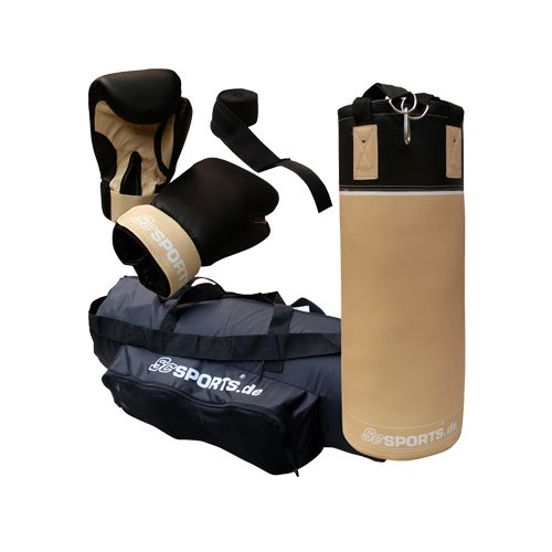 Boxset bestehend aus Boxsack mit Nylongurt, Boxhandschuhen, Boxbandagen und Packsack Das Boxset, bestehend aus Boxsack, Boxhandschuhen, Boxbandagen sowie passender Tasche, bietet beste und sicherste Trainingsvoraussetzungen, Ihnen zum Ausbau Ihrer Fitness, Ausdauer und Beweglichkeit zu verhelfen – oder einfach mal Dampf abzulassen! Die Füllung aus Baumwoll-Stoffresten verteilt sich gleichmäßig im Boxsack und schont das Material auch bei kräftigen Schlägen. Um den Boxsack noch strapazierfähiger zu machen, wurde viel Wert auf eine saubere und hochwertige Verarbeitung gelegt. Alle Nähte sind extra reißfest und besonders verstärkt vernäht. Die zur Aufhängung angebrachten Nylongurte werden zusätzlich durch Nieten gesichert. Stabile Stahlringe und Karabinerhaken sorgen für eine schnelle und einfache, aber sichere Montage. Mit dabei sind großzügig gepolsterte Boxhandschuhe in der Größe 10 oz. Für zusätzlichen Schutz der Handgelenke sorgen Boxbandagen aus Baumwolle. Auf einen Blick: 1 x Boxsack aus 100 % Polyvinylchlorid (PVC) + Textilfüllung aus 100 % Baumwolle 1 x Paar Boxhandschuhe aus 100 % Polyurethan, gepolstert mit 70 % gebundenem Schaum + 30 % Polyurethan-Schaum 1 x Paar Boxbandagen aus 100 % Baumwolle 1 x passender Packsack mit Trageriemen aus 100 % Polyester Technische Daten Boxsack: Gewicht: 12 kg Maße: 70 cm Höhe, 25 cm Ø Farbe: Beige, Schwarz Aufhängung: genietete Nylongurte + Stahlringe + Karabinerhaken Technische Daten Boxhandschuhe: Größe: 10 oz (Handumfang ohne Daumen 16,5-20 cm) Farbe: Beige, Schwarz Verschluss: Klettverschluss Besonderheiten: Schaumstoffpolsterung + verstärkte Nähte + Daumenfixierung + Lüftungslöcher