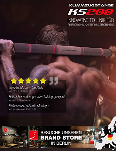 Nur bei uns erhältlich: Klimmzugstange mit hexagonalem BefestigungssystemUnsere Sportstech Klimmzugstange KS200 unterscheidet sich deutlich von herkömmlichen Stangen: Diese verteilen das Gewicht auf altmodische Art – einseitig und mit ungenügender Kraftverteilung.Nur unsere Klimmzugstange KS200 verteilt Ihr Gewicht durch einmaliges innovatives hexagonales Befestigungssystem auf 6 Druckpunkte. Dieses wird dann in 6 verschiedene Positionen abgegeben. So werden die Kräfte, die bei Ihren übungen auftreten, perfekt aufgeteilt.2 einzigartige Sicherheitsspannhebel sorgen dafür, dass sich unsere Klimmzugstange bei Ihrem Training nicht dreht: Sie bleibt immer in der von Ihnen eingestellten Stellung. Hochwertiges Material und ausgeklügelte Technik für optimale TrainingserfolgeDamit Sie bei Ihren übungen mit unserer Stange nicht abrutschen, sorgt eine 3-schichtige, fast durchgängige Griff-Polsterung. Diese ist schweißabweisend, strapazierfähig und reißfest.Unsere Klimmzugstange KS200 können Sie mühelos durch unser hochwertiges Innengewinde stufenlos verstellen. Dann ist sie bis zu einem Gewicht von 300 Kg belastbar. 1 Paar Trainingshandschuhe bekommen Sie gratis von uns. Pluspunkte gegenüber der Konkurrenz• Innovatives Hexagonales Befestigungssystem• Große, 3-lagig gepolsterte und rutschfeste Griffe• Hochwertiges Innengewinde mit Teleskopstange• 2 einzigartige Sicherheitsspannhebel• Kostenfreie Handschuhe• Stabiler Edelstahl• Außergewöhnliches Design Lieferumfang Sportstech KS200 Klimmzugstange inkl. Ebook Zusätzliches Befestigungssystem Handschuhe zum Tranieren