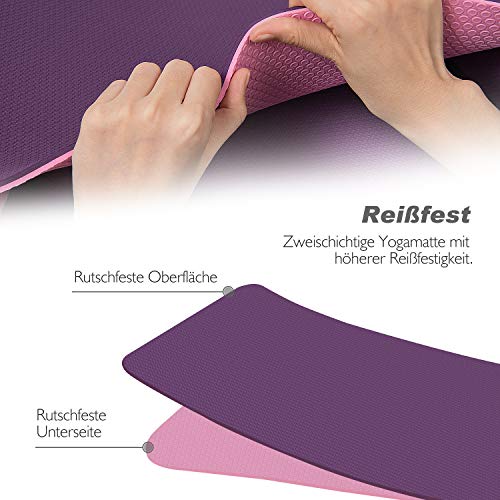 Gute Belastbarkeit Dank der guten Eigenschaften des Materials sind unsere Yogamatten gut belastbar, weich und langlebig. Sie hinterlassen nach dem Sport keine Abdrücke auf der Matte. Das Material kehrt in seine Ursprungsform nach dem Sport zurück. Leicht zu reinigen Unsere Yogamatten lassen sich mit einer weichen Bürste (oder mit einem Tuch) und Seifenwasser problemlos abwaschen. Die Farbintensität bleibt erhalten. TOP QUALITÄT Das TPE Material hat eine deutlich höhere Dichte als NBR und PVC. Dadurch sind die Matten perfekt für Yoga, Gymnastik und andere Sportarten. Sie sind nicht zu weich, aber auch nicht zu hart. Ein weiterer Vorteil ist, dass die Matten eine viel längeren Lebensdauer haben. Rutschfeste Oberfläche Durch das Profil auf den beiden Seiten sind unsere Yogamatten besonders rutschfest. – Auf der Vorderseite wrid ein schönes Muster aufgeprägt, dadurch bieten die Matten eine sehr gute Rutschfestigkeit. – Auf der Rückseite haben die Matten ein Wellenmuster, somit rutschen die Matten auf dem Boden nicht.