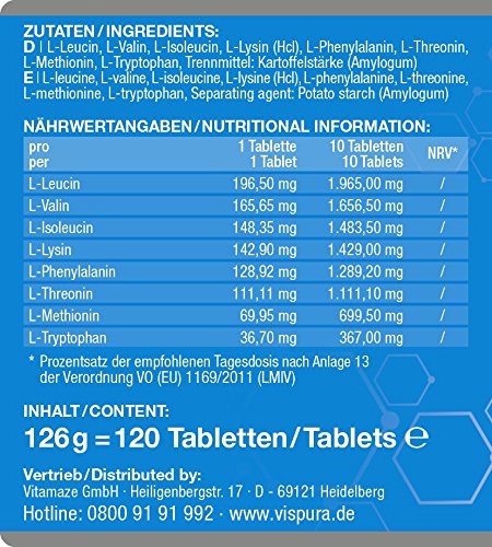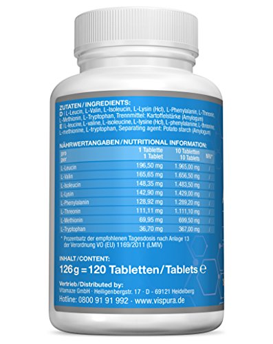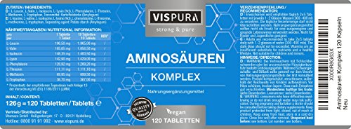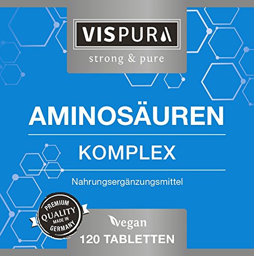 Vispura steht für anwenderfreundliche Nahrungsergänzungsmittel, welche unter höchsten pharmazeutischen Bedingungen ausschließlich in Deutschland hergestellt werden.Unser VISPURA Aminosäuren Komplex überzeugt auch Experten und unsere treuen Kunden. Diese empfehlen gerne unseren Aminosäuren Komplex wegen: der optimalen Kombination aus 8 essentiellen Aminosäuren mit mehr als 1.000 mg Aminosäuren pro Tablette: dies entspricht mehr als 10.000 mg Aminosäure pro Tagesdosis der XL-Dose: 120 vegane Tabletten zur Dauerversorgung. der freien und kristallinen Form der Aminosäuren, sie werden natürlich durch Fermentation gewonnen und sind somit vegan. der Eignung für Allergiker, da unsere Produkte frei von Gluten, Laktose und anderen Allergenen sind. der deutschen Qualität: Unsere Produktion richtet sich nach dem HACCP-Konzept. WICHTIG: Unser VISPURA Aminosäuren Komplex ist OHNE das Trennmittel Magnesiumstearat, um die gute Bioverfügbarkeit zu erhalten.VISPURA Aminosäuren Komplex mit den 8 essentiellen Aminosäuren im optimalen Verhältnis:• L-Leucine• L-Lysin• L-Valin• L-Isoleucin• L-Lysin• L-Phenylalanin• L-Threonin• L-Methionine• L-Tryptophan Profitieren Sie heute von dem speziellen Online-Preis direkt vom Hersteller und sparen Sie gutes Geld. Selbstverständlich nehmen wir unser Produkt kostenlos innerhalb von 30 Tagen auch wieder zurück. Tausende Kunden sind bereits von unseren Produkten überzeugt. Werden auch Sie zum begeisterten Anwender.