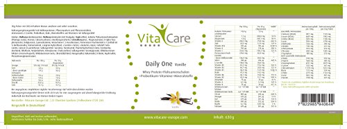 Daily One Vanille – Protein-Shake von Vitacare Viele Sportler zählen Protein-Drinks nach dem Training einfach dazu. Die gesteigerte Proteinzufuhr lässt Muskeln schneller wachsen und ist dabei mit nur 94 Kcal pro Portion. Der Vitacare Daily One macht satt und versorgt deinen Körper mit allen wichtigen Nährstoffen. Dieser Shake ist mit intensivem Vanille-Geschmack ein echtes Highlight für die Geschmacksnerven. Unser Proteinpulver besteht aus wertvollen Rohstoffen wie Whey-Protein, Flohsamenschalen, Bioflavonoide und Probiotikum und enthält darüber hinaus wichtige Vitamine und Mineralstoffe. Durch die konzentrierte Form dieser lebenswichtigen Stoffe werden zahlreiche Stoffwechselvorgänge des Körpers unterstützt. Flohsamenschalen und Probiotikum zum Beispiel fördern eine gesunde Darmflora. L-Carnitin sorgt für einen verbesserten Fettstoffwechsel. Der Proteinshake ist ideal zur Unterstützung beim Muskelaufbau und zur Gewichtsabnahme bei Diäten. Vitacare Daily One ist außerdem die optimale Ergänzung zur Vitacare Stoffwechselkur. Eine Packung enthält 630 Gramm. Einfach 30 Gramm Pulver mit 300 ml kaltem Wasser vermischen und den Vanille-Shake sofort genießen. Eine Portion enthält 19 Gramm Protein. Bitte achten Sie aber darüber hinaus auch auf eine ausgewogene Ernährung. Der Shake dient der Ernährungsergänzung und ersetzt nicht eine gesunde Lebensweise. Vitacare Produkte werden in Deutschland hergestellt. Den Daily One gibt es auch in der veganen Variante. Neben Vanillegeschmack haben wir auch eine Schoko-Version im Sortiment. Nie war es so einfach, das Wohlbefinden und die tägliche Leistungsfähigkeit zu steigern. Der leckere Shake lässt sich einfach in den Tagesablauf integrieren – das perfekte Produkt für aktive Männer und Frauen!