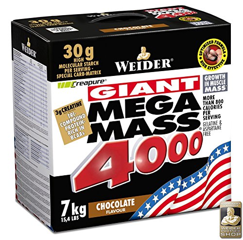 Giant Weider Mega Mass 4000 Weight Gainer (Kohlenhydrat-Proteinmischung) mit dem Zusatz von Mikronährstoffen und Creatin.TrainingsphaseMasseaufbauphase – insbesondere für Hardgainer!KraftaufbauphaseProdukteigenschaftenAufgewertet durch den Einsatz von Creatin und hochmolekularer StärkeUnterstützt den Aufbau von Kraft und Muskelmasse*Kreatin erhöht die körperliche Leistung bei Schnellkrafttraining im Rahmen kurzzeitiger intensiver körperlicher BetätigungEnthält einen Kohlenhydrat-Proteinmix mit dem Zusatz von Vitaminen und Mineralstoffen (Vitamin E, Vitamin C, Vitamin B1, Vitamin B2, Niacin, Vitamin B6, Folsäure, Biotin, Pantothensäure) und Mineralstoffe (Calcium, Phosphor, Eisen, Zink, Jod).Reines CREAPURE Kreatin zugesetzt1 Portion enthält: 49 g Eiweiß,128 g Kohlenhydrate und nur 14 g Fett => 845 kcal pro Shake (pro Portion = 150 g in 550 ml fettarmer Milch (1,5 % Fett))* Proteine tragen zu einer Zunahme an Muskelmasse bei.Eine abwechslungsreiche und ausgewogene Ernährung und eine gesunde Lebensweise werden empfohlen.BesonderheitenLiefert 30 g hochmolekulare Stärke + 3 g Creatin pro Portion!InformationMega Mass 4000 enthält jetzt die Kombination aus Creatin und hochmolekularer Stärke.*Die eingesetzte Drei-Komponenteneiweißmischung aus Milch (Isolat), Molke (Isolat) und Eiklarprotein und allen wichtigen Aminosäuren unterstützt den Aufbau von Muskelmasse.** Proteine tragen zu einer Zunahme an Muskelmasse bei.EinnahmeempfehlungTäglich 1-2 Shakes. Auch an trainingsfreien Tagen!Die Empfehlung gilt für den Zeitraum von 6 Wochen. Anschließend 2-4 Wochen Pause einlegen.Hinweise: Nicht für Kinder und Jugendliche geeignet. Die Zufuhr von Kreatin kann durch vermehrte Wassereinlagerung in der Muskulatur zu einer Gewichtszunahme führen. Die angegebene Dosierungsempfehlung darf nicht überschritten werden!Eine abwechslungsreiche und ausgewogene Ernährung und eine gesunde Lebensweise werden empf